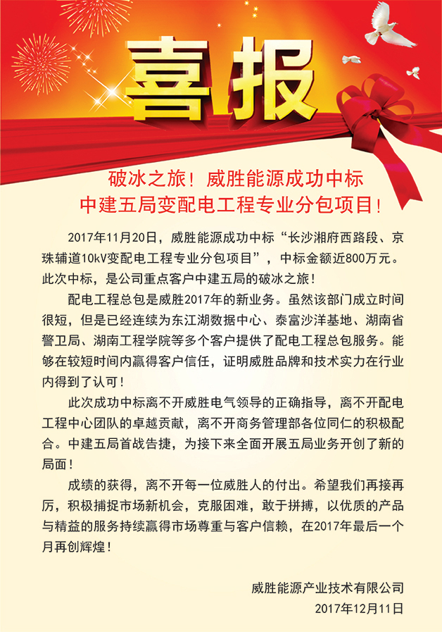 2017年11月20日,惟遠(yuǎn)能源成功中標(biāo)“長(zhǎng)沙湘府西路段、京珠輔道10kV變配電工程專業(yè)分包項(xiàng)目”,中標(biāo)金額近800萬(wàn)元。此次中標(biāo),是公司重點(diǎn)客戶中建五局的破冰之旅!