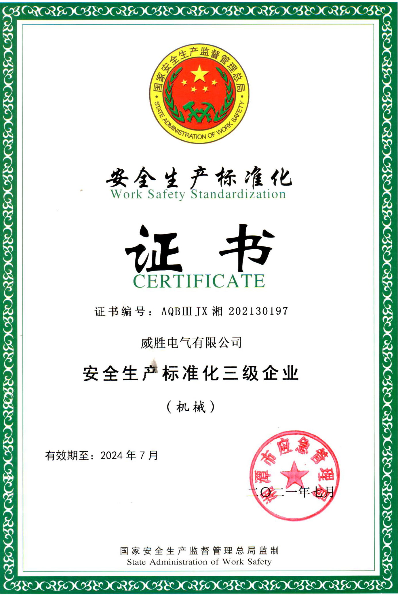 安全生產標準化三級證書