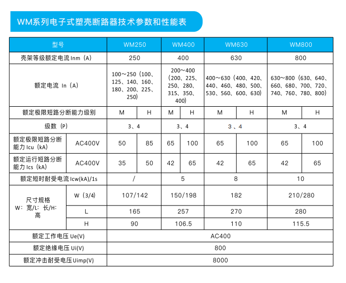 其額定工作電壓至690V、額定絕緣電壓至800V、額定沖擊耐受電壓達(dá)到BKV、額定工作電流16A-800A。WM系列斷路器適用于配電和電動(dòng)機(jī)保護(hù)場合,也適用于消防場合。斷路器具有過載、短路、欠壓保護(hù)等功能,能保護(hù)線路和電源設(shè)備不受損壞。