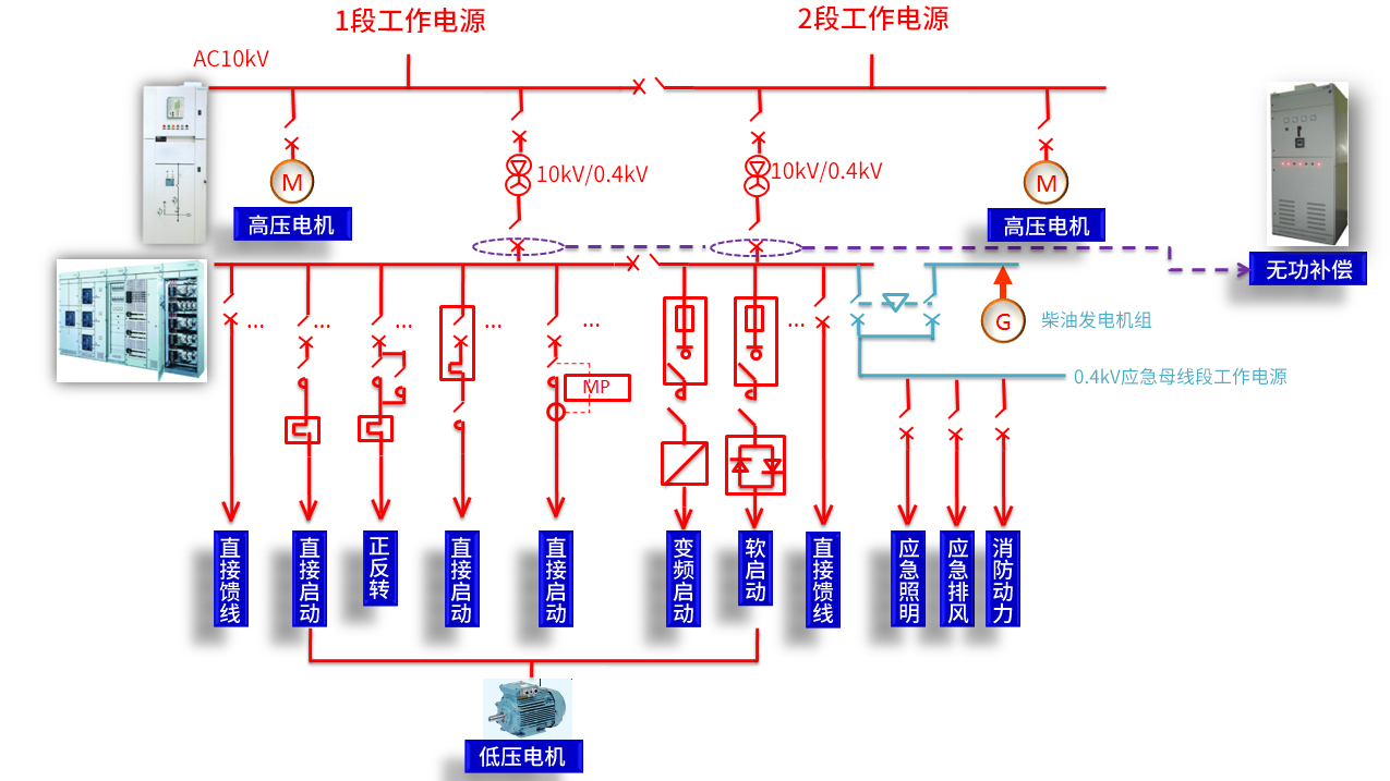 威勝電氣廠礦企業配電系統解決方案特別針對國內廠礦企業中低壓10KV/0.4KV配電系統。一個雙回路電源進線的高壓10KV配電所,正常供電時,分段隔離開關斷開,兩段母線分別車間變電所供電。在兩端母線上都皆有電壓互感器和避雷器,用于計量和防雷保護。低壓母線上接有補償無功功率的電容器,以提高工廠功率因數。廠礦企業配電解決方案根據電源以及電能輸送、分配、控制等一次設備之間的關系可供設備包含10KV開關柜、0.4KV開關柜及其配套相關配電設備。