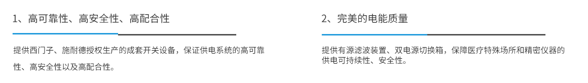 根據醫院配電系統的特殊性,我司設計了高可靠性、高安全性的配電系統。中低壓配電開關柜可選用施耐德或西門子授權柜;特殊醫療場所,如手術區等,可選用高可靠性的雙電源切換箱;針對精密醫療設備,對電能質量要求特別高的場合,可選用具有完美濾波功能的壁掛式有源濾波裝置,節省占用空間,也方便后期改造擴容。