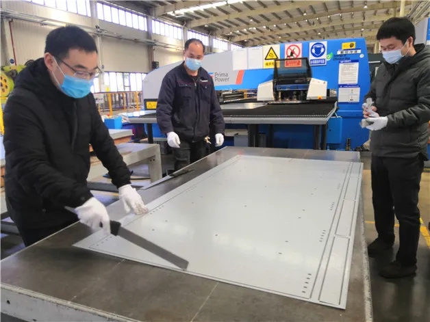 要完成任務(wù),主要有兩大困難:一是需要緊急調(diào)配相關(guān)生產(chǎn)配套,尤其是如何在最短時(shí)間內(nèi)協(xié)調(diào)核心元器件各項(xiàng)物料到位,實(shí)現(xiàn)有序銜接;二是在于如何在短時(shí)間內(nèi)切實(shí)保障產(chǎn)品質(zhì)量,做到生產(chǎn)的高效、精準(zhǔn)。接到任務(wù)的第一時(shí)間,智能電氣成套事業(yè)部總經(jīng)理黃水庚和技術(shù)部、生產(chǎn)部相關(guān)人員商討電氣產(chǎn)品方案,憑借標(biāo)準(zhǔn)化圖紙?jiān)O(shè)計(jì),完成圖紙繪制與技術(shù)資料下達(dá)工作。在完成車間現(xiàn)場(chǎng)消毒后,威勝電氣一線員工迅速到崗,一切工作都在緊張而有序的進(jìn)行著。一次生產(chǎn)運(yùn)營(yíng)中心總監(jiān)朱崇明全面部署生產(chǎn)、計(jì)劃、倉(cāng)儲(chǔ)等交付鏈相關(guān)部門(mén),全員武裝、全力投入生產(chǎn)。依靠高效、高質(zhì)的流水線作業(yè),目前,該2個(gè)項(xiàng)目完成了鈑金件自制、銅排設(shè)計(jì)、銅排制作等工序內(nèi)容。