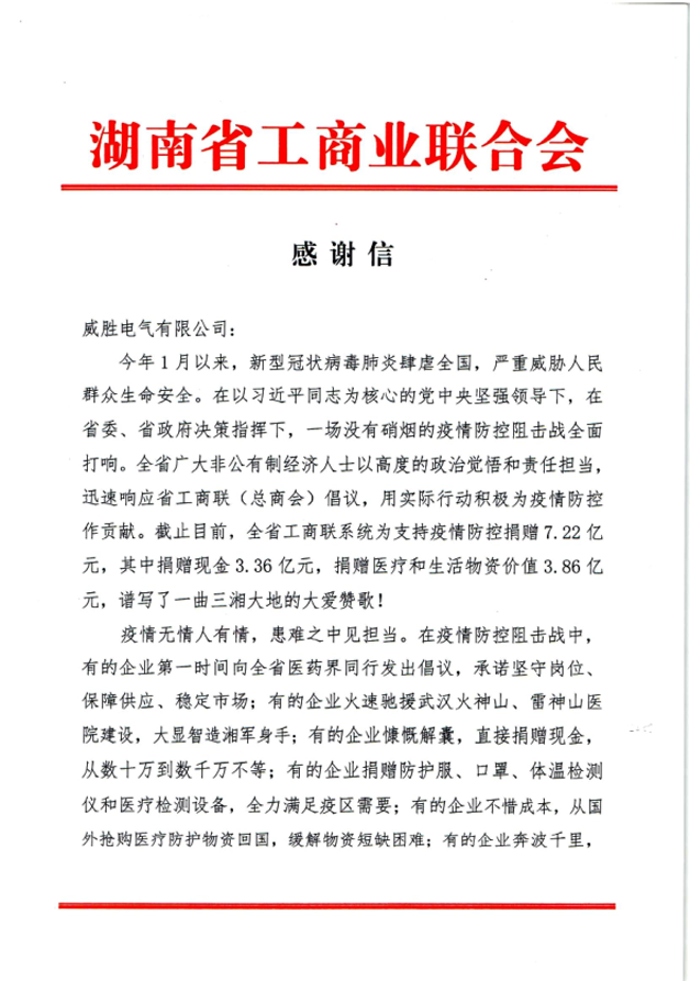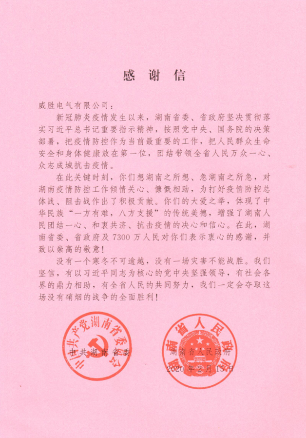 近期,威勝電氣先后收到來自中共湖南省委、湖南省人民政府及湖南省工商業聯合會的感謝信,信中表達了對威勝電氣在疫情期間馳援一線善舉的肯定與贊揚。