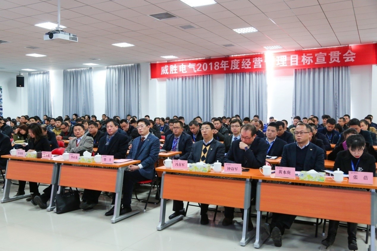 2018年1月8日下午,以“銳意進取,創新發展”為主題的威勝電氣2018年經營管理目標宣貫會在電氣產業園會議中心培訓室順利召開。控股董事會吉主席、控股本部、威勝電氣董事會以及經營管理團隊的各位領導、威勝電氣員工代表共計260余人參加了本次會議,會議由威勝電氣行政人事總監鄧超艷女士主持。