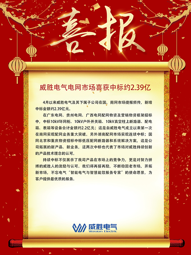 4月以來威勝電氣及其下屬子公司在國、南網(wǎng)市場捷報(bào)頻傳,新增中標(biāo)金額約2.39億元。