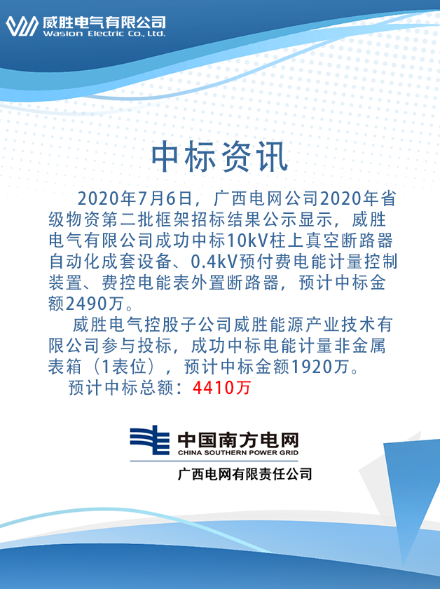 2020年7月6日,廣西電網(wǎng)公司2020年省級物資第二批框架招標結果公示顯示,威勝電氣有限公司成功中標10kV柱上真空斷路器自動化成套設備、0.4kV預付費電能計量控制裝置、費控電能表外置斷路器,預計中標金額2490萬。