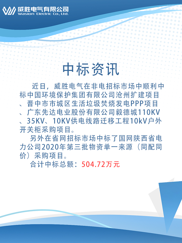 近日,威勝電氣在非電招標市場中順利中標中國環境保護集團有限公司滄州擴建項目、晉中市市城區生活垃圾焚燒發電PPP項目、廣東先達電業股份有限公司毅德城110KV、35KV、10KV供電線路遷移工程10kV戶外開關柜采購項目。