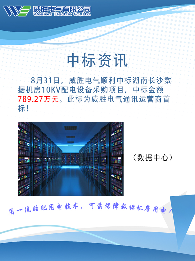 8月31日,威勝電氣順利中標(biāo)湖南長沙數(shù)據(jù)機房10KV配電設(shè)備采購項目,中標(biāo)金額789.27萬元。此標(biāo)為威勝電氣通訊運營商首標(biāo)!