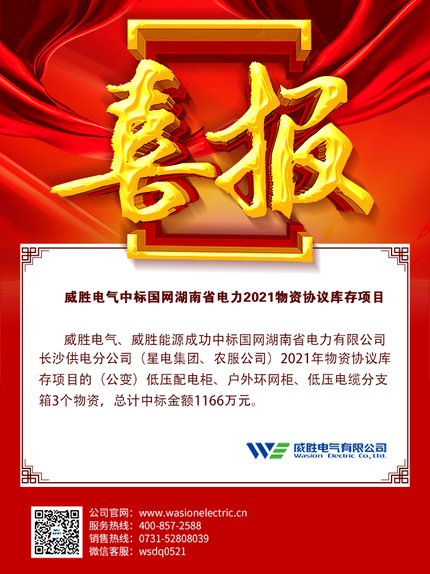 威勝電氣、惟遠能源成功中標國網湖南省電力有限公司長沙供電分公司(星電集團、農服公司)2021年物資協議庫存項目的(公變)低壓配電柜、戶外環網柜、低壓電纜分支箱3個物資,總計中標金額1166萬元。