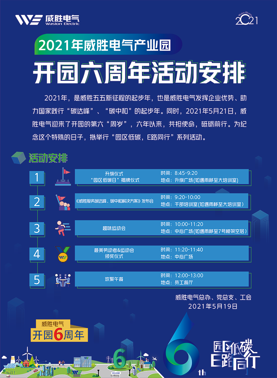 2021年5月21日是威勝電氣開園六周年,將開展“園區低碳、E路同行”系列活動。具體安排詳見下方海報: