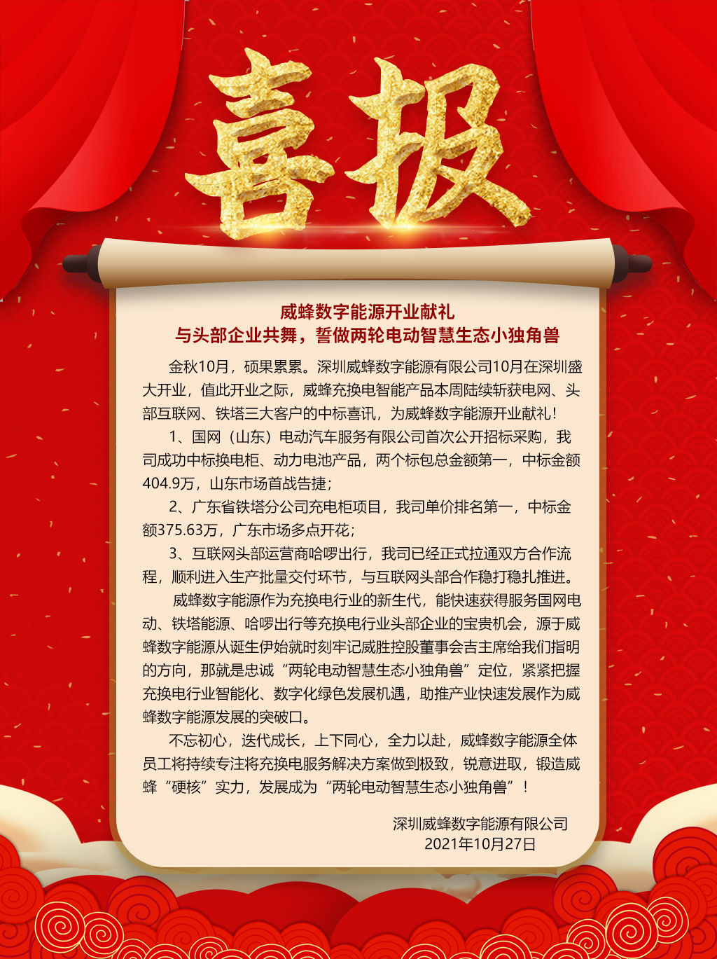 金秋10月,碩果累累。深圳威蜂數(shù)字能源有限公司10月在深圳盛大開(kāi)業(yè),值此開(kāi)業(yè)之際,威蜂充換電智能產(chǎn)品本周陸續(xù)斬獲電網(wǎng)、頭部互聯(lián)網(wǎng)、鐵塔三大客戶(hù)的中標(biāo)喜訊,為威蜂數(shù)字能源開(kāi)業(yè)獻(xiàn)禮!