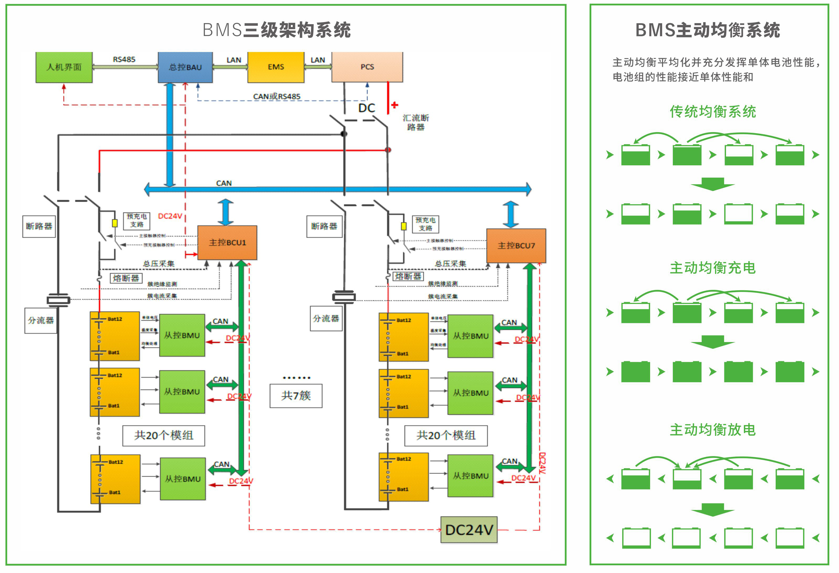 采用BMS保護三級架構系統,實現對電池/PACK/電池簇/電池系統的實時監測/告警/保護;采取主動均衡技術:在靜置、放電、充電階段不同階段均可實現箱內/箱間/均衡;防環流抑制策略:通過黃金電阻,設計防環流預充電路,克服電池簇直接并聯的環流問題,同時實現簇間均衡; BMS自主研發:BMS專業研發團隊,自主研發從控及主控以及換電系統的保護板三類電池管理系統;