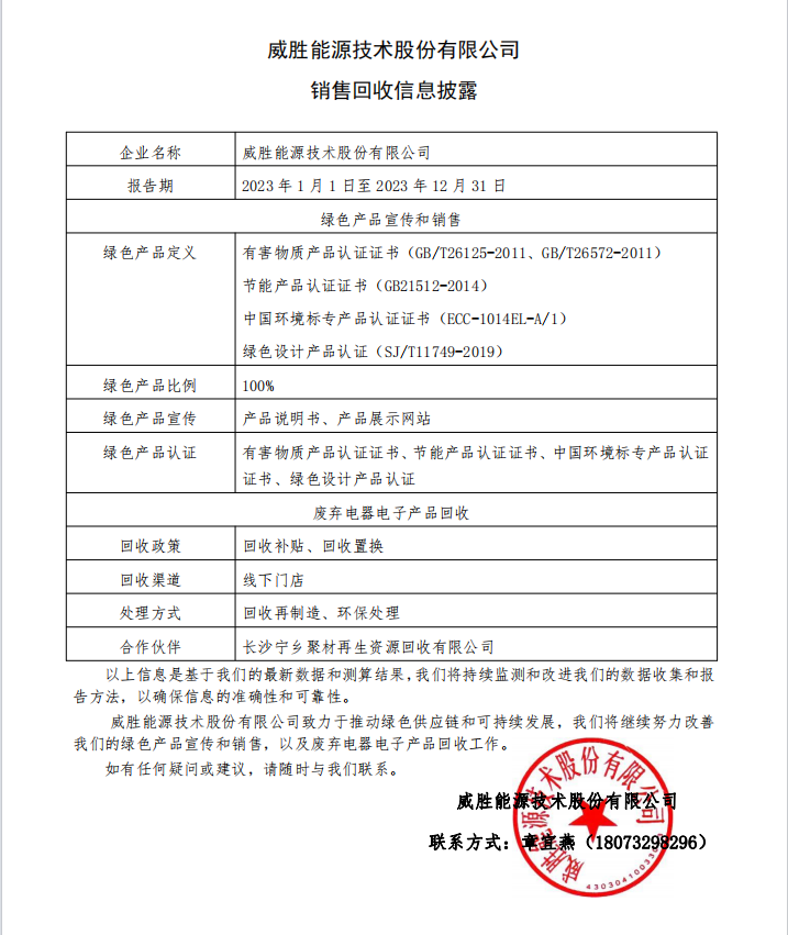 惟遠能源技術股份有限公司-銷售回收信息披露