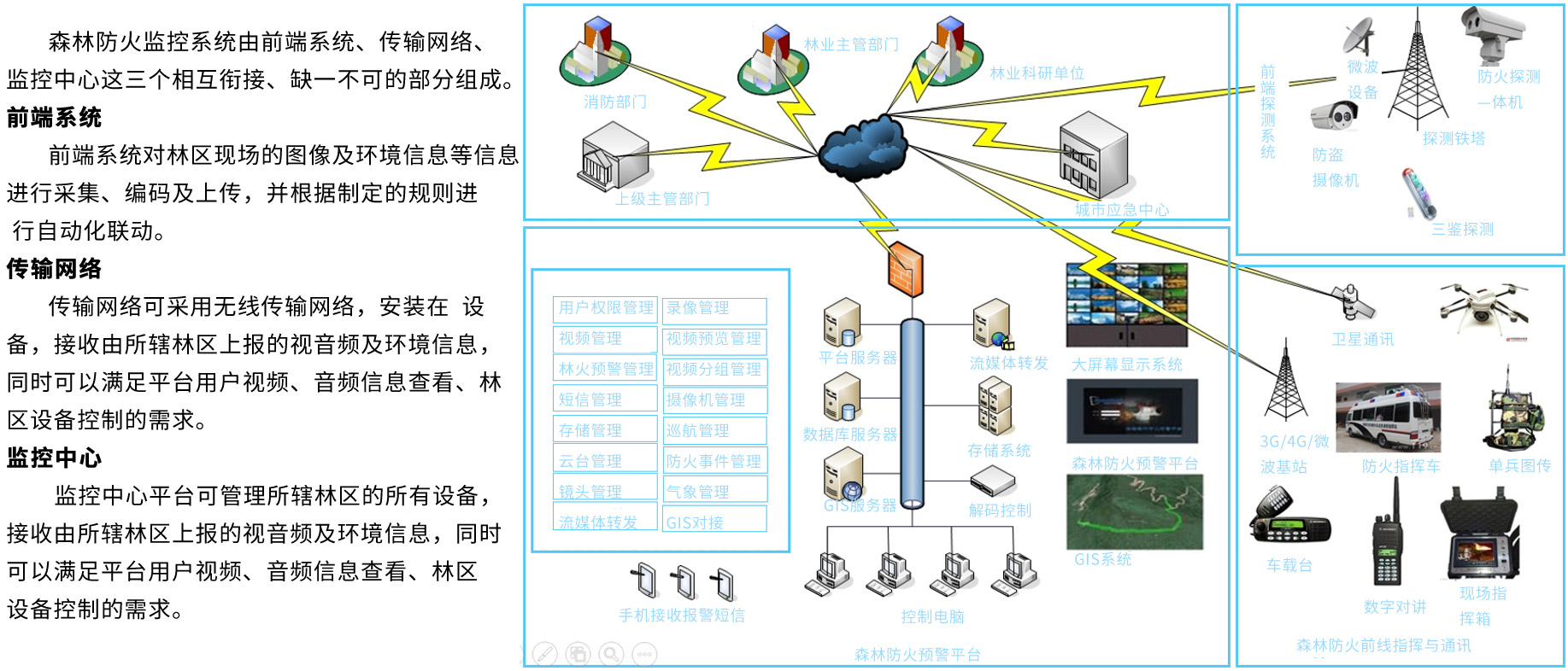 智慧森林防火監(jiān)控系統(tǒng),就是利用無縫融合的智能圖像識別技術(shù)、面向?qū)ο蟮?D GIS技術(shù)、大型網(wǎng)絡(luò)監(jiān)控技術(shù)等高新技術(shù),結(jié)合林業(yè)管理的專業(yè)知識和林業(yè)防火的經(jīng)驗,實現(xiàn)林區(qū)視頻的自動監(jiān)控、煙火準確識別、火點精確定位、火情蔓延趨勢推演、撲救指揮的輔助決策、災(zāi)后評估等多方面功能,建立森林防火的完整業(yè)務(wù)鏈,并針對性地解決用戶的各種個性化需求,最終實現(xiàn)對林區(qū)的保護和可持續(xù)發(fā)展。